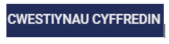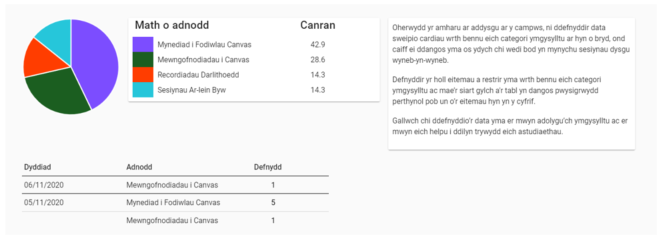 Ar frig y dudalen mae pennyn sy’n cynnwys gwybodaeth megis eich enw a’ch cwrs. Ceir nifer o ddangosyddion hefyd sy’n caniatáu ichi weld gwybodaeth allweddol mewn amrantiad.