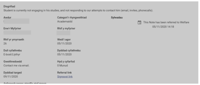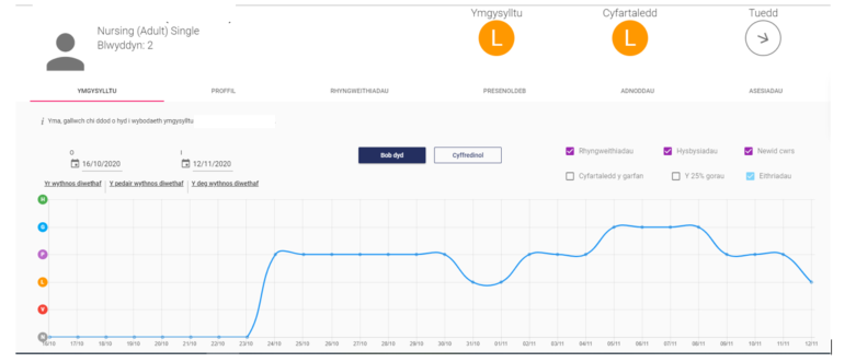Mae sgoriau ymgysylltu sy'n rhan o'r categorïau Isel (L), Isel Iawn (V) a Dim (N) yn adlewyrchu ymgysylltu anghyson a gallai olygu y bydd eich Cyfadran/Ysgol neu Wasanaethau Cydymffurfio Myfyrwyr yn cysylltu â chi i drafod eich lefelau ymgysylltu yn unol â'r Polisi Monitro Ymgysylltu er mwyn sicrhau eich lles a chynnig cymorth.