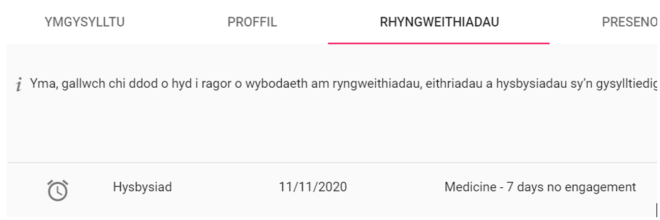 b) Digwyddiadau drwy Rybudd (h.y. os ydych chi wedi gosod rhybudd ar gyfer ymgysylltu isel parhaus fel a nodir yn y Polisi Monitro Ymgysylltu)