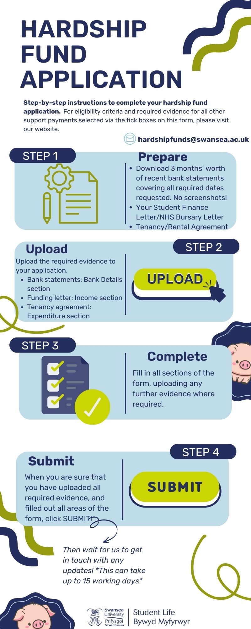 The hardship fund is now open for the academic year of 25/26 for enrolled students. If you have any questions, please contact hardshipfunds@swansea.ac.uk